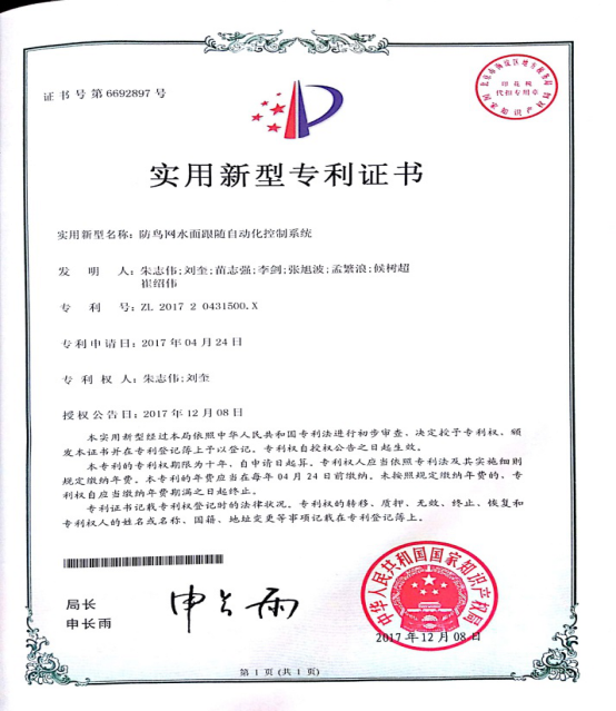 圖5防鳥網(wǎng)水面跟隨自動化控制系統(tǒng)專利證書
