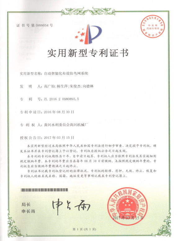 圖6自動智能化布設(shè)防鳥網(wǎng)專利證書