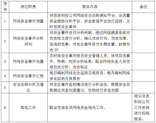 本項目分為1個標段,采購4名網(wǎng)絡安全駐場服務人員,具體工作內(nèi)容如下: