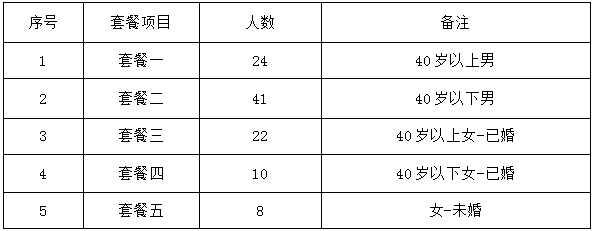 4. 采購范圍:采購范圍涵蓋本年度北京區(qū)域體檢人員包括北京分公司本部、惠南莊管理處和退休職工,人員共計(jì)105人。40歲以上男職工24人,40歲以下男職工41人,40歲以上女職工22人,40歲以下女職工10人,未婚女職工8人。