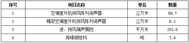 4. 采購內(nèi)容:本項目采購內(nèi)容主要包括空調(diào)室外機(jī)排風(fēng)陣列消聲器1組、精密空調(diào)室外機(jī)排風(fēng)陣列消聲器1組、進(jìn)排風(fēng)隔聲圍擋252.6平方米、降噪鋼結(jié)構(gòu)7.4噸以及使上述設(shè)備設(shè)施發(fā)揮作用所必須的制作、運(yùn)輸、組裝、安裝服務(wù)。